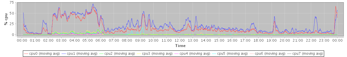avg(cpu0) = 14.68 avg(cpu1) = 20.84 avg(cpu2) = 0.77 avg(cpu3) = 1.01 avg(cpu4) = 0.37 avg(cpu5) = 0.82 avg(cpu6) = 0.11 avg(cpu7) = 0.25