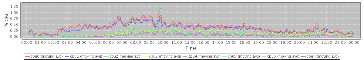 avg(cpu0) = 1.59 avg(cpu1) = 1.53 avg(cpu2) = 1.01 avg(cpu3) = 1.01 avg(cpu4) = 0.75 avg(cpu5) = 0.76 avg(cpu6) = 0.72 avg(cpu7) = 0.54
