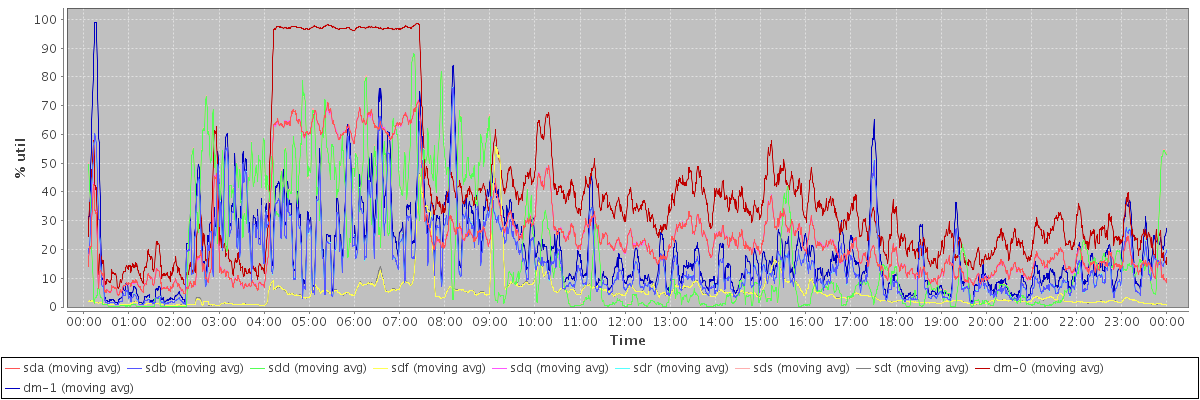 avg(sda) = 25.17 avg(sdb) = 15.78 avg(sdd) = 18.62 avg(sdf) = 5.08 avg(sdq) = 25.15 avg(sdr) = 15.79 avg(sds) = 18.64 avg(sdt) = 5.13 avg(dm-0) = 39.24 avg(dm-1) = 19.99