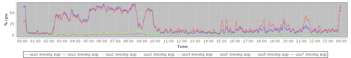 avg(cpu0) = 1.43 avg(cpu1) = 1.22 avg(cpu2) = 0.96 avg(cpu3) = 0.78 avg(cpu4) = 0.70 avg(cpu5) = 0.66 avg(cpu6) = 0.47 avg(cpu7) = 0.31