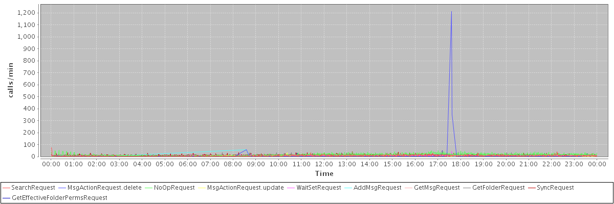 max(SearchRequest) = 76.00 max(MsgActionRequest.delete) = 1212.00 max(NoOpRequest) = 55.00 max(MsgActionRequest.update) = 31.00 max(WaitSetRequest) = 44.00 max(AddMsgRequest) = 57.00 max(GetMsgRequest) = 24.00 max(GetFolderRequest) = 44.00 max(SyncRequest) = 41.00 max(GetEffectiveFolderPermsRequest) = 48.00