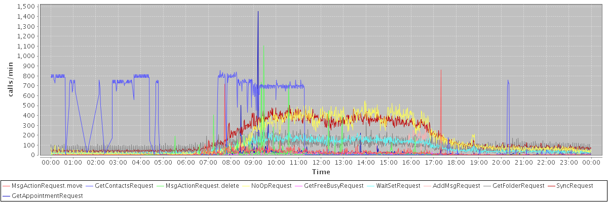 max(MsgActionRequest.move) = 861.00 max(GetContactsRequest) = 857.00 max(MsgActionRequest.delete) = 1107.00 max(NoOpRequest) = 550.00 max(GetFreeBusyRequest) = 221.00 max(WaitSetRequest) = 245.00 max(AddMsgRequest) = 291.00 max(GetFolderRequest) = 330.00 max(SyncRequest) = 502.00 max(GetAppointmentRequest) = 1453.00