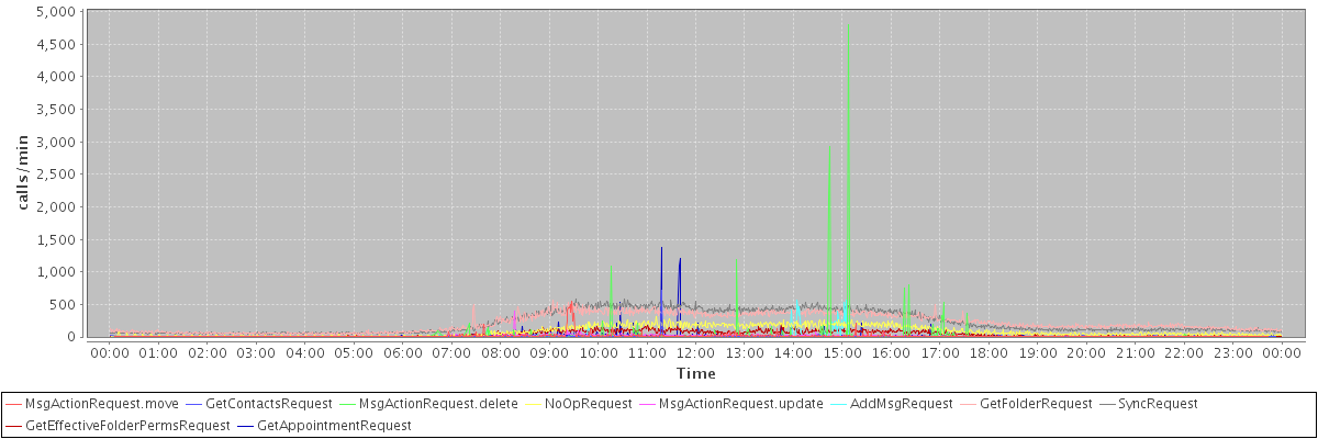 max(MsgActionRequest.move) = 546.00 max(GetContactsRequest) = 723.00 max(MsgActionRequest.delete) = 4805.00 max(NoOpRequest) = 314.00 max(MsgActionRequest.update) = 391.00 max(AddMsgRequest) = 569.00 max(GetFolderRequest) = 564.00 max(SyncRequest) = 587.00 max(GetEffectiveFolderPermsRequest) = 204.00 max(GetAppointmentRequest) = 1380.00