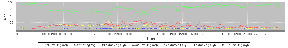 avg(user) = 12.83 avg(sys) = 1.72 avg(idle) = 78.54 avg(iowait) = 6.71 avg(nice) = 0.00 avg(irq) = 0.00 avg(softirq) = 0.19