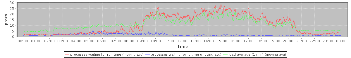avg(processes waiting for run time) = 10.79 avg(processes waiting for io time) = 1.09 avg(load average (1 min)) = 11.20