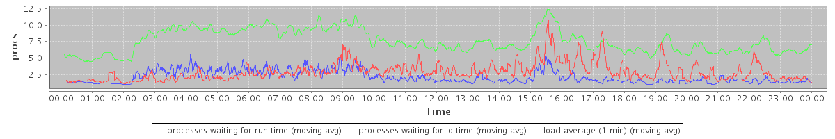 avg(processes waiting for run time) = 2.67 avg(processes waiting for io time) = 1.66 avg(load average (1 min)) = 7.55