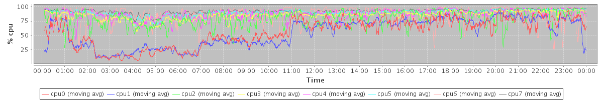 avg(cpu0) = 20.89 avg(cpu1) = 24.05 avg(cpu2) = 1.63 avg(cpu3) = 1.59 avg(cpu4) = 1.19 avg(cpu5) = 1.02 avg(cpu6) = 0.55 avg(cpu7) = 0.60