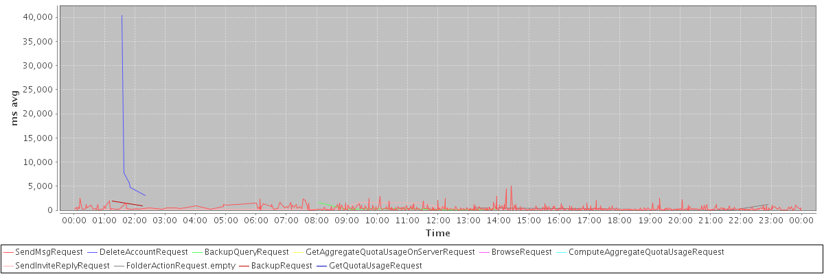 avg(SendMsgRequest) = 391.08 avg(DeleteAccountRequest) = 12291.60 avg(BackupQueryRequest) = 427.50 avg(GetAggregateQuotaUsageOnServerRequest) = 1302.00 avg(BrowseRequest) = 327.00 avg(ComputeAggregateQuotaUsageRequest) = 4084.00 avg(SendInviteReplyRequest) = 534.22 avg(FolderActionRequest.empty) = 601.67 avg(BackupRequest) = 1463.00 avg(GetQuotaUsageRequest) = 1551.00