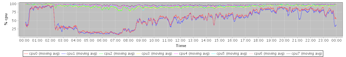 avg(cpu0) = 1.51 avg(cpu1) = 1.51 avg(cpu2) = 0.87 avg(cpu3) = 0.88 avg(cpu4) = 0.60 avg(cpu5) = 0.61 avg(cpu6) = 0.59 avg(cpu7) = 0.43