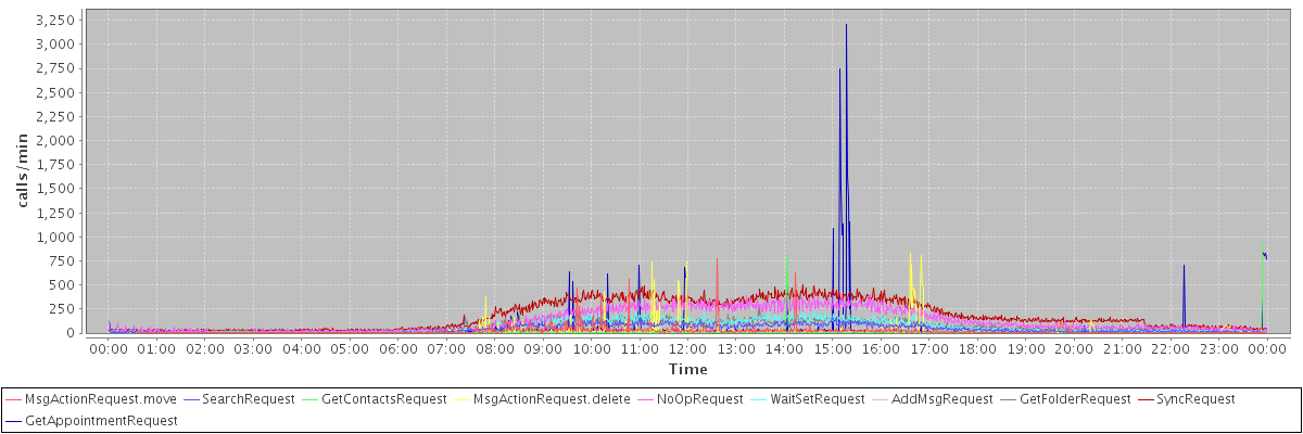 max(MsgActionRequest.move) = 772.00 max(SearchRequest) = 165.00 max(GetContactsRequest) = 944.00 max(MsgActionRequest.delete) = 830.00 max(NoOpRequest) = 403.00 max(WaitSetRequest) = 227.00 max(AddMsgRequest) = 399.00 max(GetFolderRequest) = 273.00 max(SyncRequest) = 501.00 max(GetAppointmentRequest) = 3210.00
