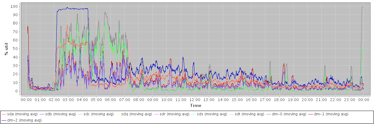 avg(sda) = 13.83 avg(sdb) = 9.13 avg(sdc) = 12.88 avg(sdq) = 13.85 avg(sdr) = 9.13 avg(sds) = 12.87 avg(sdt) = 4.46 avg(dm-0) = 16.72 avg(dm-1) = 11.65 avg(dm-2) = 23.04