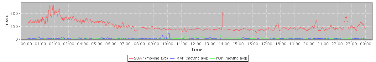 avg(DeleteAccountRequest) = 26432.00 avg(BackupQueryRequest) = 982.00 avg(GetAggregateQuotaUsageOnServerRequest) = 889.00 avg(SyncGalRequest) = 34700.29 avg(FolderActionRequest.delete) = 2299.60 avg(ForwardAppointmentInviteRequest) = 7623.00 avg(ApplyFilterRulesRequest) = 1894.83 avg(ForwardAppointmentRequest) = 605.50 avg(FolderActionRequest.empty) = 4658.67 avg(GetQuotaUsageRequest) = 1058.00