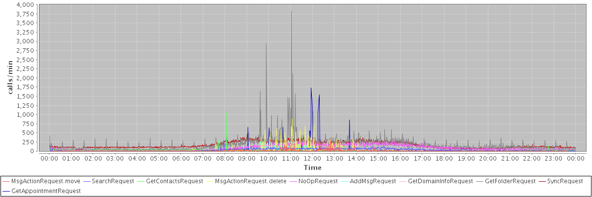 max(MsgActionRequest.move) = 451.00 max(SearchRequest) = 304.00 max(GetContactsRequest) = 1085.00 max(MsgActionRequest.delete) = 889.00 max(NoOpRequest) = 305.00 max(AddMsgRequest) = 290.00 max(GetDomainInfoRequest) = 296.00 max(GetFolderRequest) = 3832.00 max(SyncRequest) = 484.00 max(GetAppointmentRequest) = 1733.00