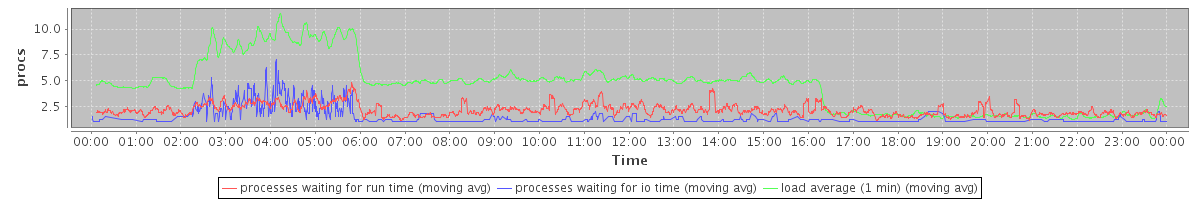 avg(processes waiting for run time) = 2.11 avg(processes waiting for io time) = 0.59 avg(load average (1 min)) = 4.49