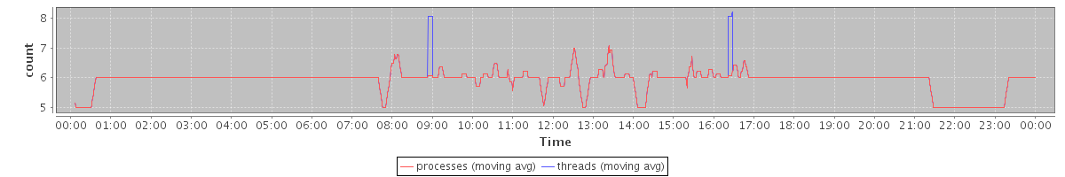 avg(tripwire) = 1018.50 avg(java) = 2296.31 avg(gzip) = 2600.81 avg(mysqld) = 920.05 avg(perl) = 40.25 avg(httpd) = 34.00 avg(mysqldump) = 153.67 avg(zmmailboxd) = 3695.84 avg(horsewatcher-fe) = 44.15 avg(zmcompresslogs) = 1738.54