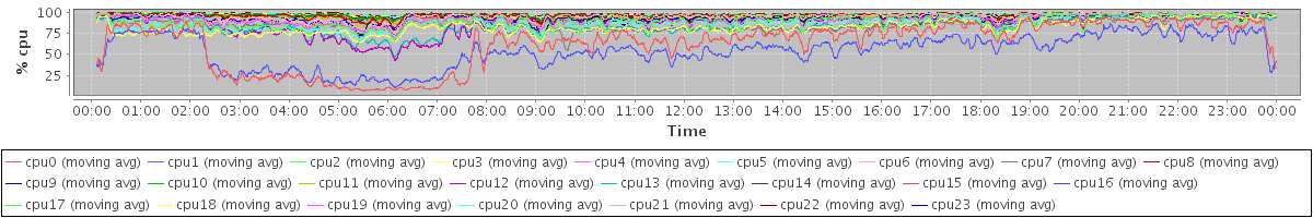 avg(cpu0) = 19.48 avg(cpu1) = 21.16 avg(cpu2) = 1.22 avg(cpu3) = 1.58 avg(cpu4) = 0.75 avg(cpu5) = 1.00 avg(cpu6) = 0.26 avg(cpu7) = 0.67 avg(cpu8) = 0.12 avg(cpu9) = 0.27 avg(cpu10) = 0.09 avg(cpu11) = 0.20 avg(cpu12) = 5.77 avg(cpu13) = 5.37 avg(cpu14) = 0.16 avg(cpu15) = 0.35 avg(cpu16) = 0.13 avg(cpu17) = 0.31 avg(cpu18) = 0.06 avg(cpu19) = 0.16 avg(cpu20) = 0.05 avg(cpu21) = 0.21 avg(cpu22) = 0.04 avg(cpu23) = 0.44