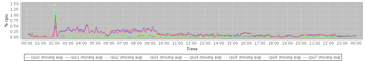 avg(cpu0) = 0.14 avg(cpu1) = 0.15 avg(cpu2) = 0.03 avg(cpu3) = 0.03 avg(cpu4) = 0.02 avg(cpu5) = 0.02 avg(cpu6) = 0.01 avg(cpu7) = 0.03