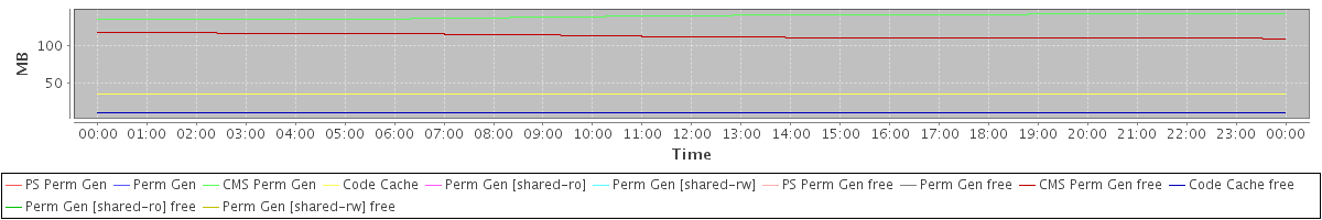 avg(PS Perm Gen) = 0.00 avg(Perm Gen) = 0.00 avg(CMS Perm Gen) = 138.82 avg(Code Cache) = 35.44 avg(Perm Gen [shared-ro]) = 0.00 avg(Perm Gen [shared-rw]) = 0.00 avg(PS Perm Gen free) = 0.00 avg(Perm Gen free) = 0.00 avg(CMS Perm Gen free) = 112.93 avg(Code Cache free) = 11.12 avg(Perm Gen [shared-ro] free) = 0.00 avg(Perm Gen [shared-rw] free) = 0.00