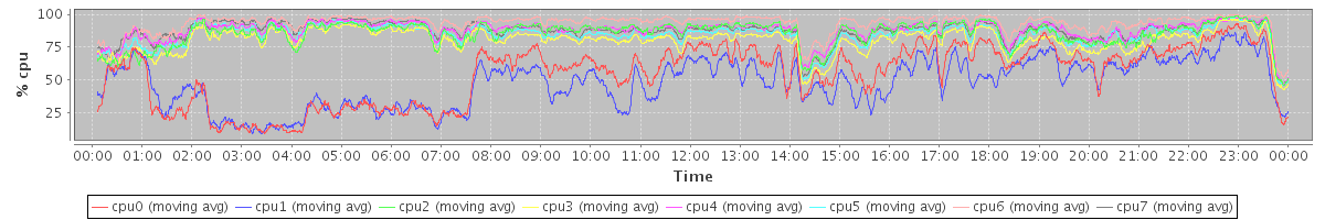 avg(cpu0) = 23.51 avg(cpu1) = 25.94 avg(cpu2) = 1.77 avg(cpu3) = 2.12 avg(cpu4) = 1.16 avg(cpu5) = 1.40 avg(cpu6) = 0.44 avg(cpu7) = 0.86