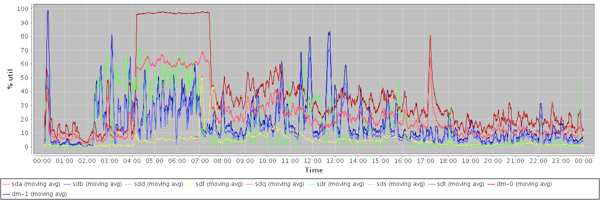 avg(sda) = 22.53 avg(sdb) = 14.20 avg(sdd) = 15.22 avg(sdf) = 4.66 avg(sdq) = 22.56 avg(sdr) = 14.18 avg(sds) = 15.23 avg(sdt) = 4.70 avg(dm-0) = 35.89 avg(dm-1) = 18.18