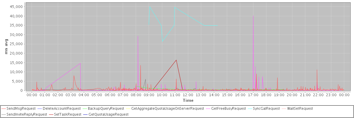avg(SendMsgRequest) = 455.02 avg(DeleteAccountRequest) = 8724.00 avg(BackupQueryRequest) = 871.33 avg(GetAggregateQuotaUsageOnServerRequest) = 841.00 avg(GetFreeBusyRequest) = 264.84 avg(SyncGalRequest) = 36229.22 avg(WaitSetRequest) = 232.56 avg(SendInviteReplyRequest) = 416.00 avg(SetTaskRequest) = 1409.17 avg(GetQuotaUsageRequest) = 1113.00
