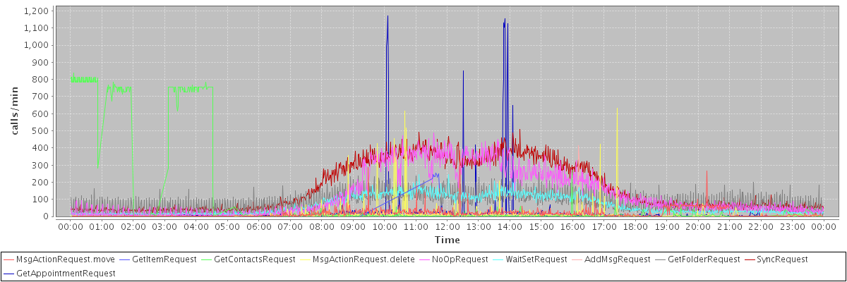 max(MsgActionRequest.move) = 384.00 max(GetItemRequest) = 254.00 max(GetContactsRequest) = 839.00 max(MsgActionRequest.delete) = 631.00 max(NoOpRequest) = 487.00 max(WaitSetRequest) = 244.00 max(AddMsgRequest) = 412.00 max(GetFolderRequest) = 256.00 max(SyncRequest) = 509.00 max(GetAppointmentRequest) = 1172.00