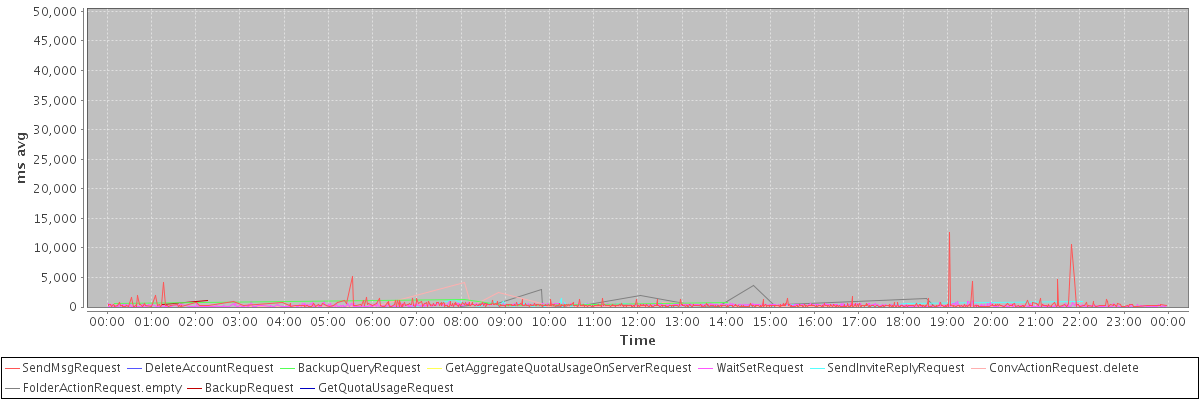 avg(SendMsgRequest) = 350.15 avg(DeleteAccountRequest) = 48171.00 avg(BackupQueryRequest) = 641.40 avg(GetAggregateQuotaUsageOnServerRequest) = 1309.00 avg(WaitSetRequest) = 250.58 avg(SendInviteReplyRequest) = 318.08 avg(ConvActionRequest.delete) = 329.39 avg(FolderActionRequest.empty) = 649.70 avg(BackupRequest) = 778.50 avg(GetQuotaUsageRequest) = 1534.00