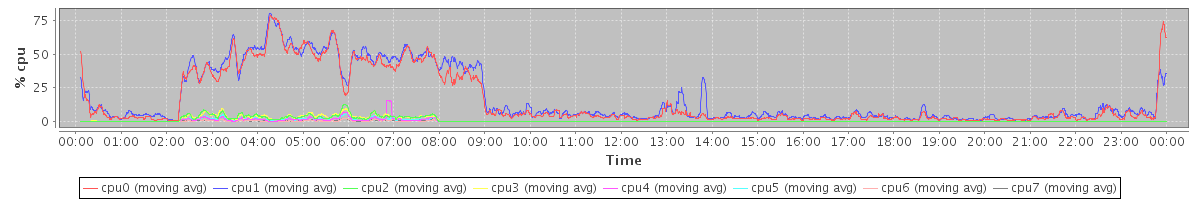 avg(cpu0) = 15.98 avg(cpu1) = 17.75 avg(cpu2) = 0.99 avg(cpu3) = 1.01 avg(cpu4) = 0.49 avg(cpu5) = 0.51 avg(cpu6) = 0.15 avg(cpu7) = 0.19