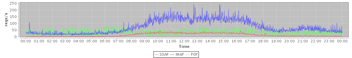 Host zm04.stanford.edu: Mailboxd: Request Rate by Client Protocol