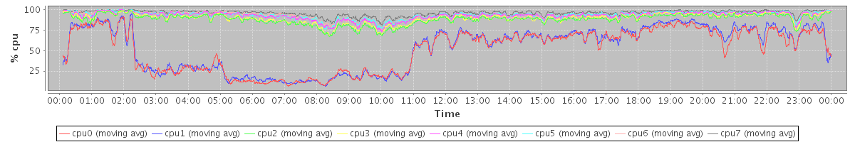 avg(cpu0) = 19.27 avg(cpu1) = 17.76 avg(cpu2) = 8.14 avg(cpu3) = 7.15 avg(cpu4) = 5.29 avg(cpu5) = 4.63 avg(cpu6) = 5.56 avg(cpu7) = 2.94