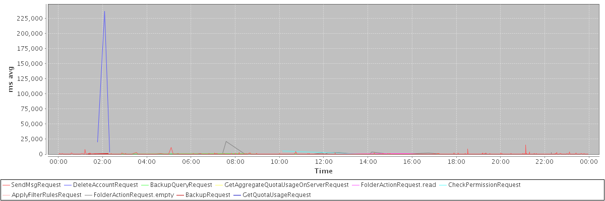 avg(SendMsgRequest) = 415.88 avg(DeleteAccountRequest) = 87101.00 avg(BackupQueryRequest) = 397.88 avg(GetAggregateQuotaUsageOnServerRequest) = 1267.00 avg(FolderActionRequest.read) = 585.60 avg(CheckPermissionRequest) = 967.83 avg(ApplyFilterRulesRequest) = 3903.00 avg(FolderActionRequest.empty) = 1092.76 avg(BackupRequest) = 1148.50 avg(GetQuotaUsageRequest) = 1438.00