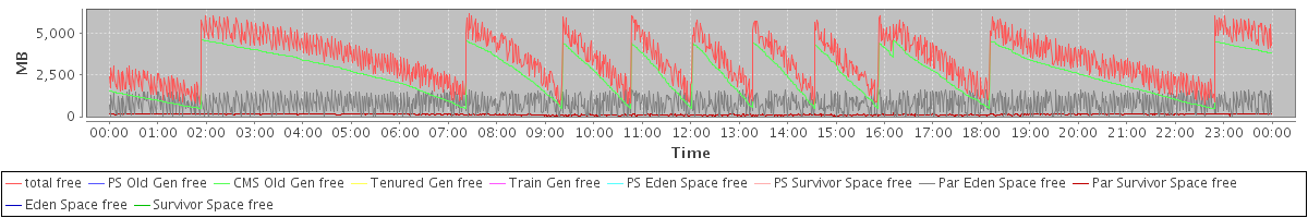 avg(total free) = 3457.37 avg(PS Old Gen free) = 0.00 avg(CMS Old Gen free) = 2526.79 avg(Tenured Gen free) = 0.00 avg(Train Gen free) = 0.00 avg(PS Eden Space free) = 0.00 avg(PS Survivor Space free) = 0.00 avg(Par Eden Space free) = 805.85 avg(Par Survivor Space free) = 124.73 avg(Eden Space free) = 0.00 avg(Survivor Space free) = 0.00
