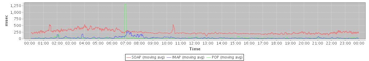 avg(SendMsgRequest) = 529.76 avg(DeleteAccountRequest) = 33013.00 avg(BackupQueryRequest) = 852.50 avg(GetAggregateQuotaUsageOnServerRequest) = 1960.00 avg(CreateAccountRequest) = 7824.76 avg(CreateAppointmentExceptionRequest) = 277.10 avg(ForwardAppointmentInviteRequest) = 1630.00 avg(SendInviteReplyRequest) = 481.82 avg(FolderActionRequest.empty) = 3756.82 avg(GetQuotaUsageRequest) = 2468.00