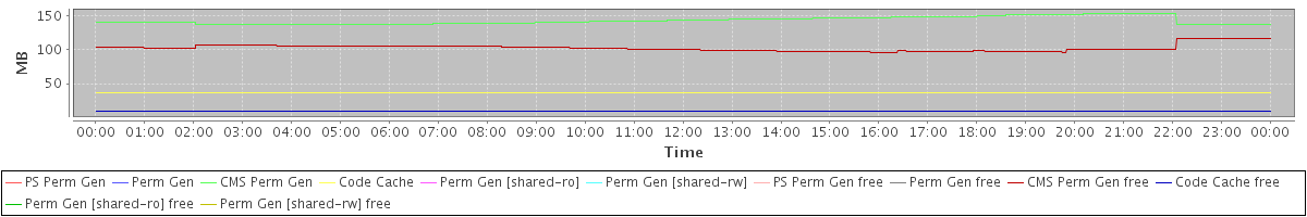 avg(PS Perm Gen) = 0.00 avg(Perm Gen) = 0.00 avg(CMS Perm Gen) = 142.64 avg(Code Cache) = 37.05 avg(Perm Gen [shared-ro]) = 0.00 avg(Perm Gen [shared-rw]) = 0.00 avg(PS Perm Gen free) = 0.00 avg(Perm Gen free) = 0.00 avg(CMS Perm Gen free) = 102.41 avg(Code Cache free) = 9.57 avg(Perm Gen [shared-ro] free) = 0.00 avg(Perm Gen [shared-rw] free) = 0.00