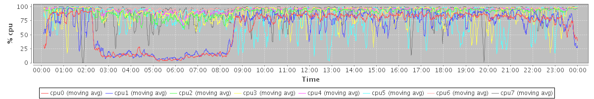 avg(cpu0) = 20.59 avg(cpu1) = 17.46 avg(cpu2) = 1.42 avg(cpu3) = 1.14 avg(cpu4) = 0.92 avg(cpu5) = 0.61 avg(cpu6) = 0.37 avg(cpu7) = 0.26
