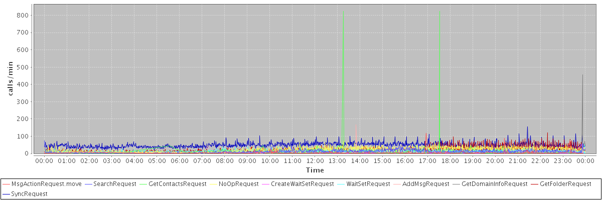 max(MsgActionRequest.move) = 117.00 max(SearchRequest) = 74.00 max(GetContactsRequest) = 824.00 max(NoOpRequest) = 71.00 max(CreateWaitSetRequest) = 55.00 max(WaitSetRequest) = 53.00 max(AddMsgRequest) = 165.00 max(GetDomainInfoRequest) = 455.00 max(GetFolderRequest) = 120.00 max(SyncRequest) = 156.00