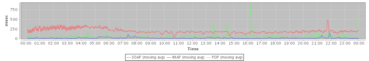 avg(SendMsgRequest) = 336.75 avg(BackupQueryRequest) = 360.25 avg(GetAggregateQuotaUsageOnServerRequest) = 1054.00 avg(CreateAppointmentExceptionRequest) = 237.92 avg(SendInviteReplyRequest) = 288.02 avg(ConvActionRequest.delete) = 528.63 avg(FolderActionRequest.empty) = 507.00 avg(SendShareNotificationRequest) = 259.56 avg(BackupRequest) = 1038.00 avg(GetQuotaUsageRequest) = 1158.00