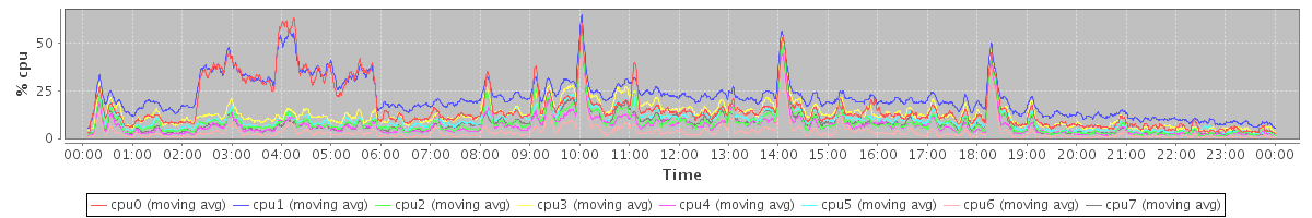 avg(cpu0) = 26.52 avg(cpu1) = 35.14 avg(cpu2) = 3.77 avg(cpu3) = 8.15 avg(cpu4) = 2.01 avg(cpu5) = 5.18 avg(cpu6) = 0.77 avg(cpu7) = 2.84