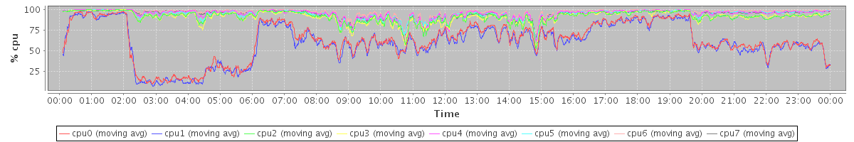 avg(cpu0) = 1.19 avg(cpu1) = 1.28 avg(cpu2) = 0.67 avg(cpu3) = 0.73 avg(cpu4) = 0.42 avg(cpu5) = 0.50 avg(cpu6) = 0.26 avg(cpu7) = 0.49