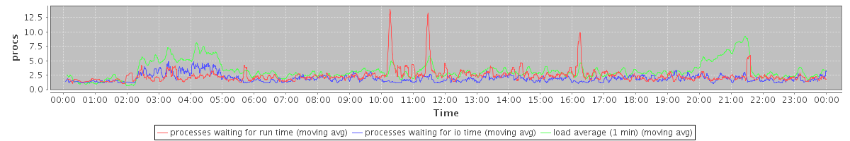 avg(processes waiting for run time) = 1.98 avg(processes waiting for io time) = 1.42 avg(load average (1 min)) = 3.29