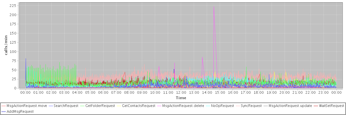 max(MsgActionRequest.move) = 44.00 max(SearchRequest) = 81.00 max(GetFolderRequest) = 71.00 max(GetContactsRequest) = 45.00 max(MsgActionRequest.delete) = 223.00 max(NoOpRequest) = 61.00 max(SyncRequest) = 65.00 max(MsgActionRequest.update) = 33.00 max(WaitSetRequest) = 41.00 max(AddMsgRequest) = 52.00