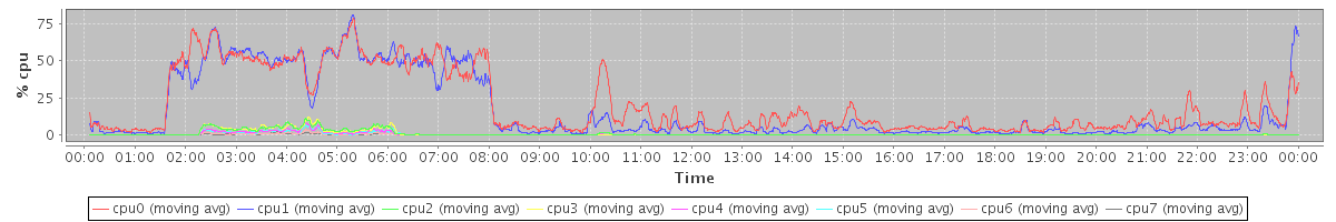 avg(cpu0) = 20.32 avg(cpu1) = 16.72 avg(cpu2) = 0.90 avg(cpu3) = 0.81 avg(cpu4) = 0.48 avg(cpu5) = 0.40 avg(cpu6) = 0.15 avg(cpu7) = 0.11