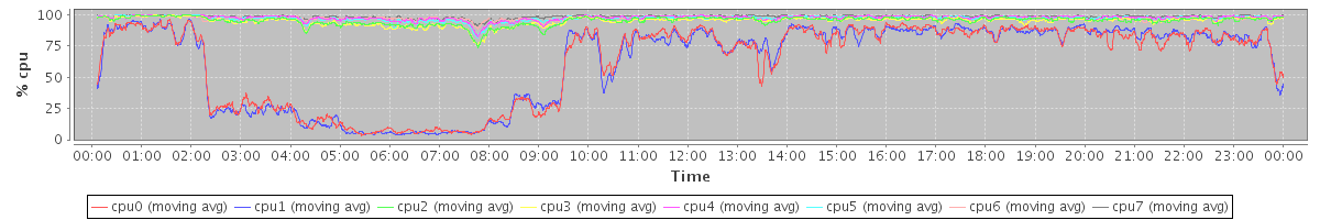 avg(cpu0) = 1.13 avg(cpu1) = 1.14 avg(cpu2) = 0.47 avg(cpu3) = 0.50 avg(cpu4) = 0.28 avg(cpu5) = 0.31 avg(cpu6) = 0.30 avg(cpu7) = 0.20