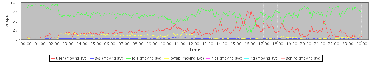 avg(user) = 21.67 avg(sys) = 2.30 avg(idle) = 68.97 avg(iowait) = 6.76 avg(nice) = 0.00 avg(irq) = 0.00 avg(softirq) = 0.30