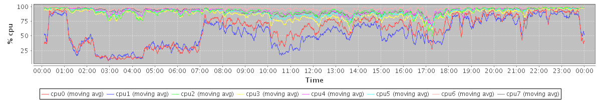 avg(cpu0) = 17.02 avg(cpu1) = 19.73 avg(cpu2) = 6.38 avg(cpu3) = 10.03 avg(cpu4) = 5.77 avg(cpu5) = 7.37 avg(cpu6) = 2.39 avg(cpu7) = 6.39