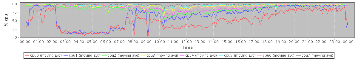 avg(cpu0) = 16.84 avg(cpu1) = 11.50 avg(cpu2) = 8.78 avg(cpu3) = 3.69 avg(cpu4) = 7.07 avg(cpu5) = 2.37 avg(cpu6) = 4.08 avg(cpu7) = 1.46