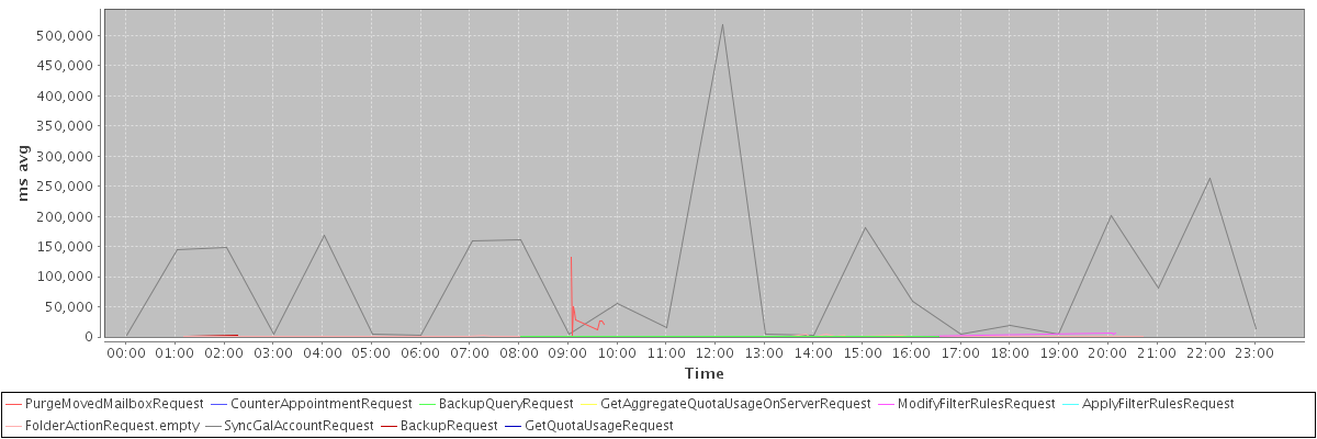 avg(PurgeMovedMailboxRequest) = 37628.11 avg(CounterAppointmentRequest) = 642.00 avg(BackupQueryRequest) = 528.60 avg(GetAggregateQuotaUsageOnServerRequest) = 1178.00 avg(ModifyFilterRulesRequest) = 1136.15 avg(ApplyFilterRulesRequest) = 2459.00 avg(FolderActionRequest.empty) = 651.16 avg(SyncGalAccountRequest) = 92742.67 avg(BackupRequest) = 2385.00 avg(GetQuotaUsageRequest) = 1363.00