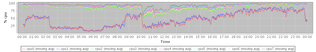 avg(cpu0) = 18.37 avg(cpu1) = 16.91 avg(cpu2) = 9.26 avg(cpu3) = 8.36 avg(cpu4) = 6.50 avg(cpu5) = 5.80 avg(cpu6) = 6.04 avg(cpu7) = 4.03