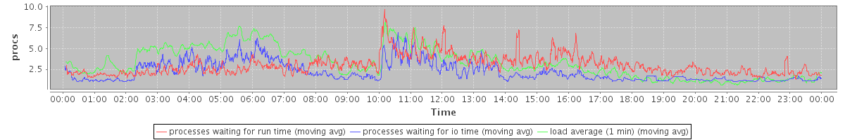 avg(processes waiting for run time) = 2.76 avg(processes waiting for io time) = 1.77 avg(load average (1 min)) = 3.28