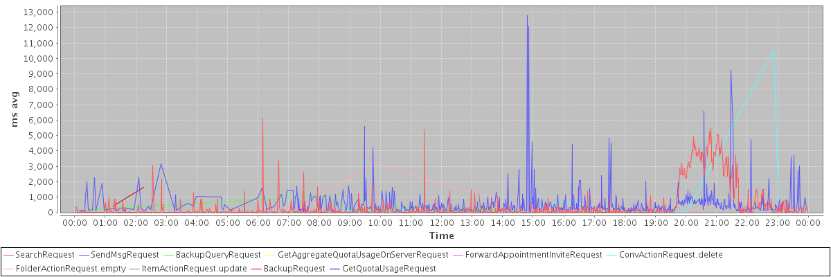 avg(SearchRequest) = 435.37 avg(SendMsgRequest) = 560.01 avg(BackupQueryRequest) = 398.00 avg(GetAggregateQuotaUsageOnServerRequest) = 2259.00 avg(ForwardAppointmentInviteRequest) = 2560.00 avg(ConvActionRequest.delete) = 590.48 avg(FolderActionRequest.empty) = 648.80 avg(ItemActionRequest.update) = 624.00 avg(BackupRequest) = 1020.50 avg(GetQuotaUsageRequest) = 3266.00
